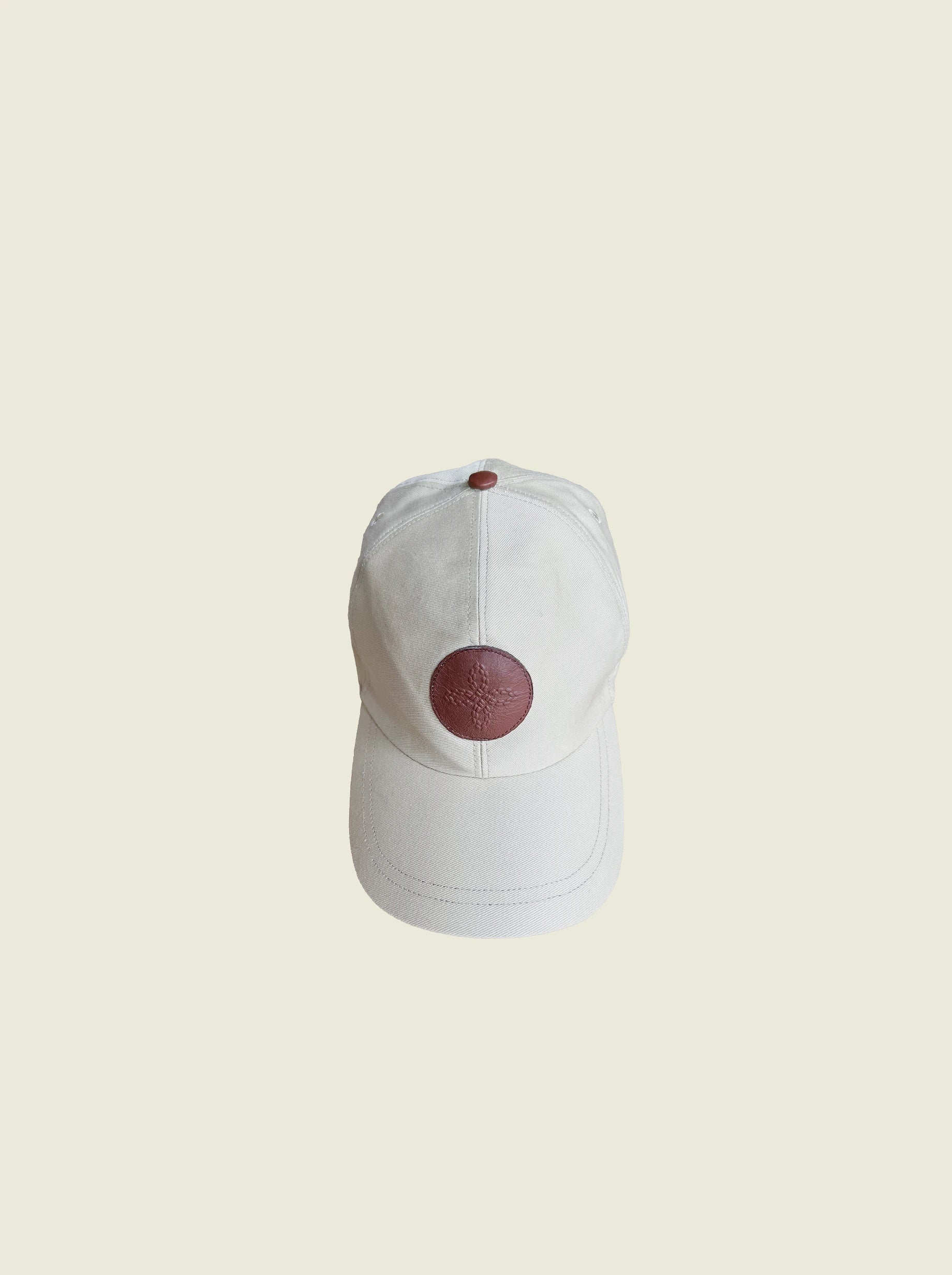 Casquette en toile de coton beige, rehaussée d’un emblème circulaire en cuir de vachette marron, finement gravé du logo SOCO.