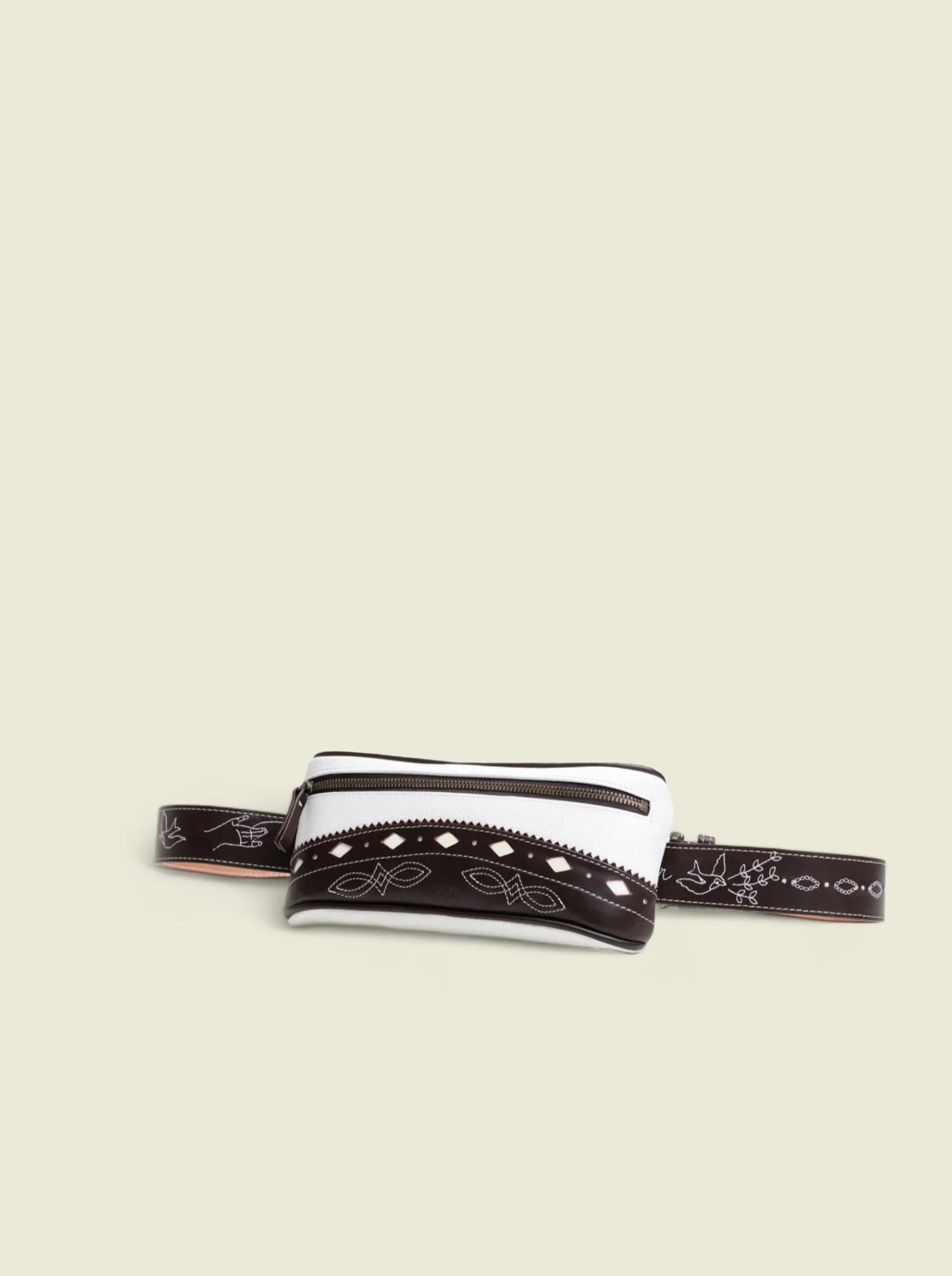 Ce sac banane en cuir lisse et grainé de bovin se porte à la ceinture, en crossbody ou à l'épaule grâce à ses multiples options de portés : ceinture brodée, chaîne ou anse en cuir, toutes amovibles.