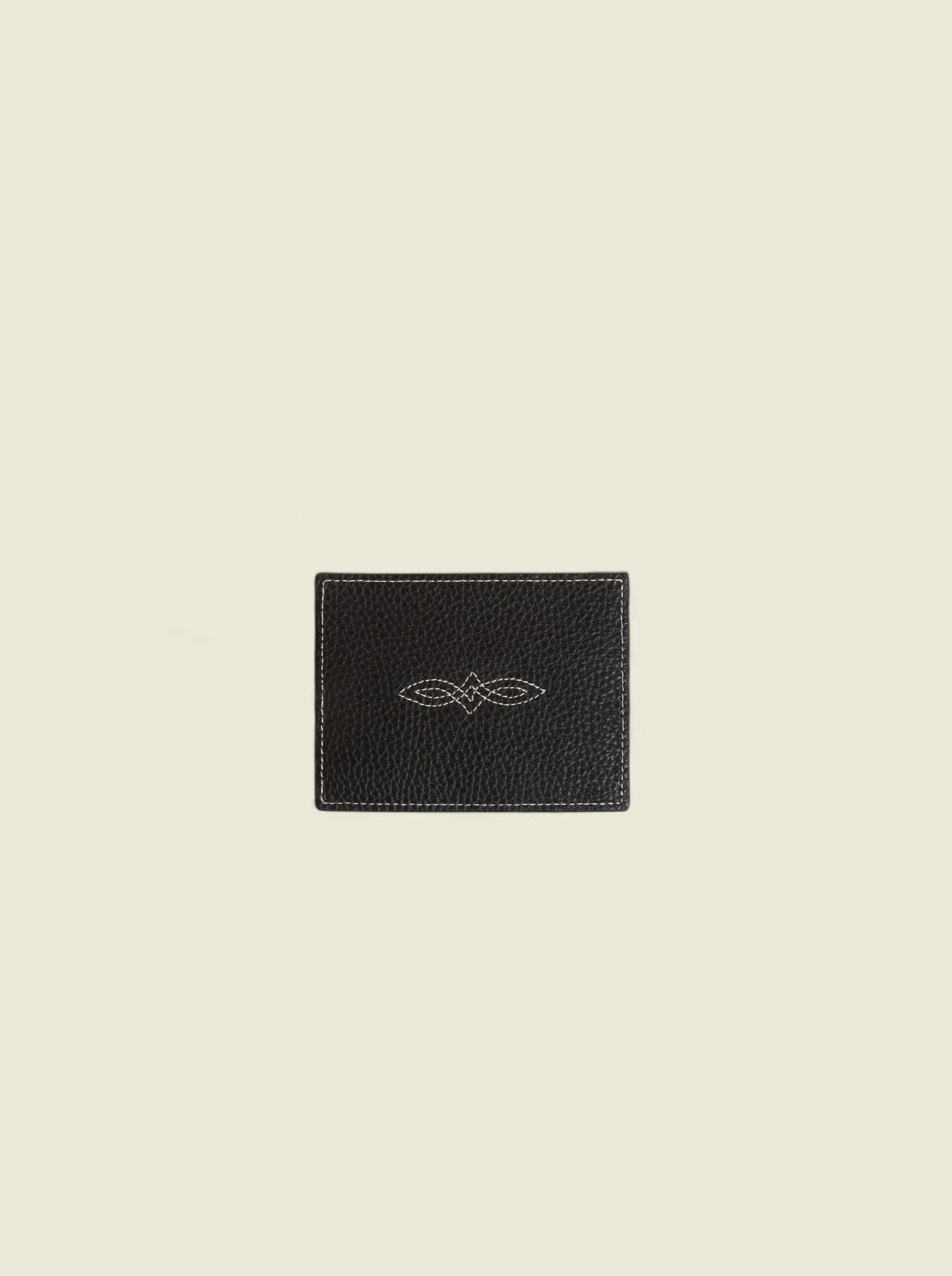 Porte-cartes bi-matière en cuir de bovin, associant cuir grainé et cuir lisse, souligné par des surpiqûres contrastées.