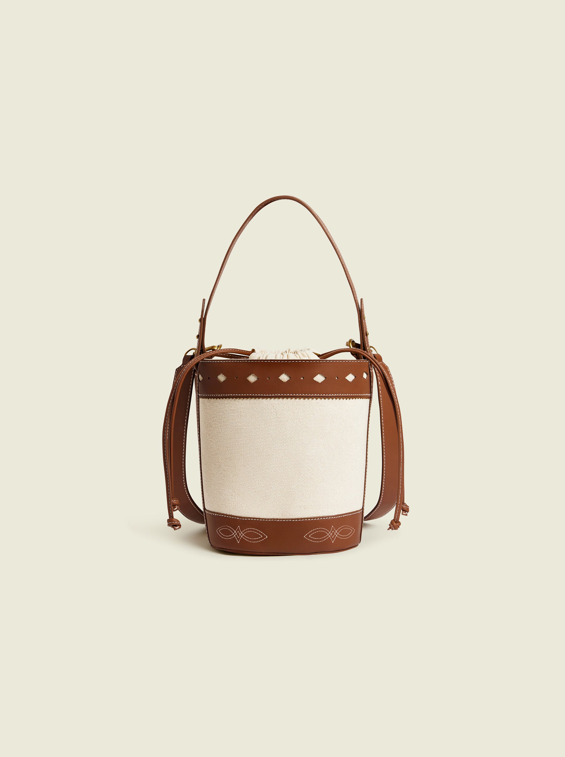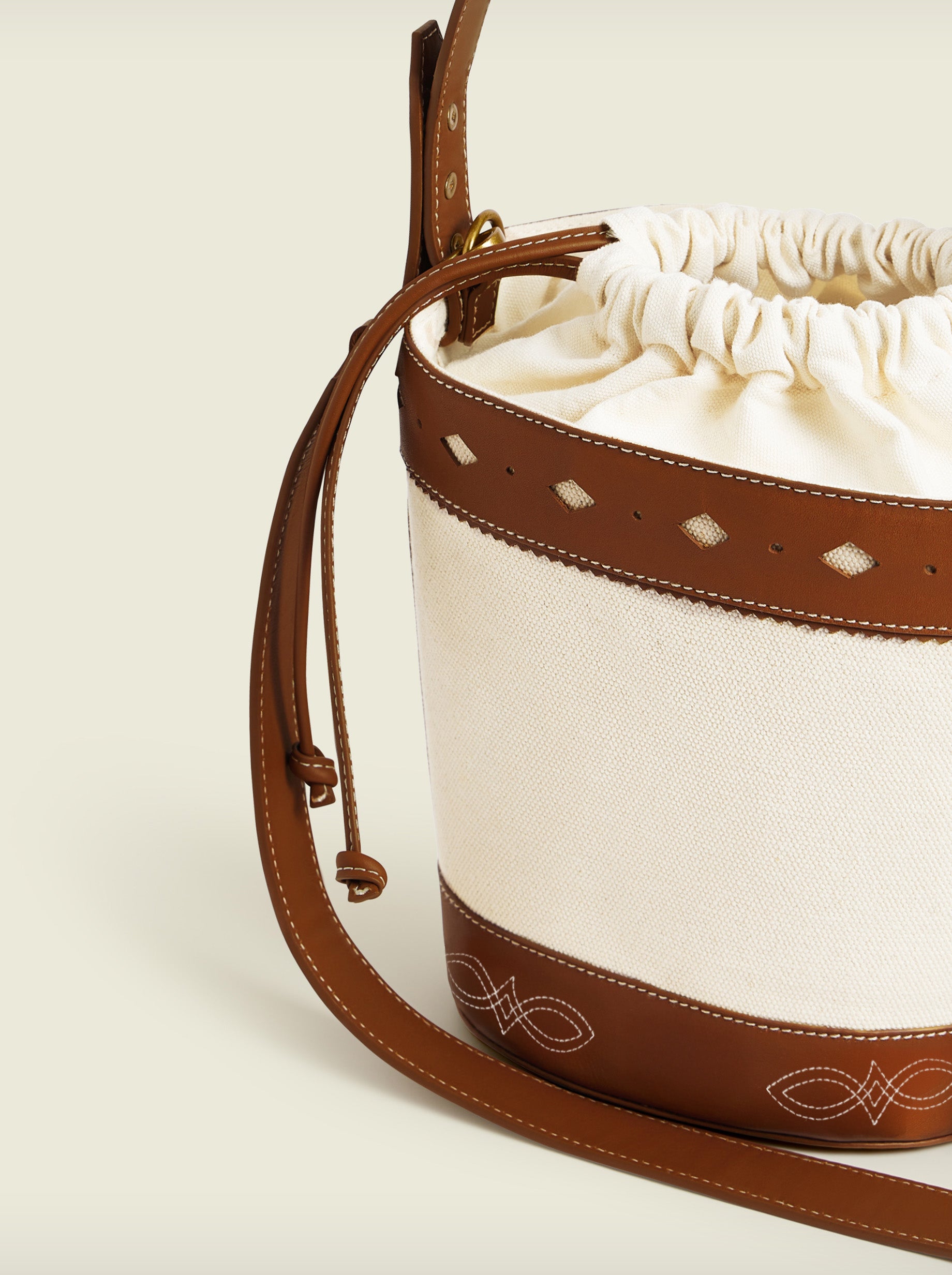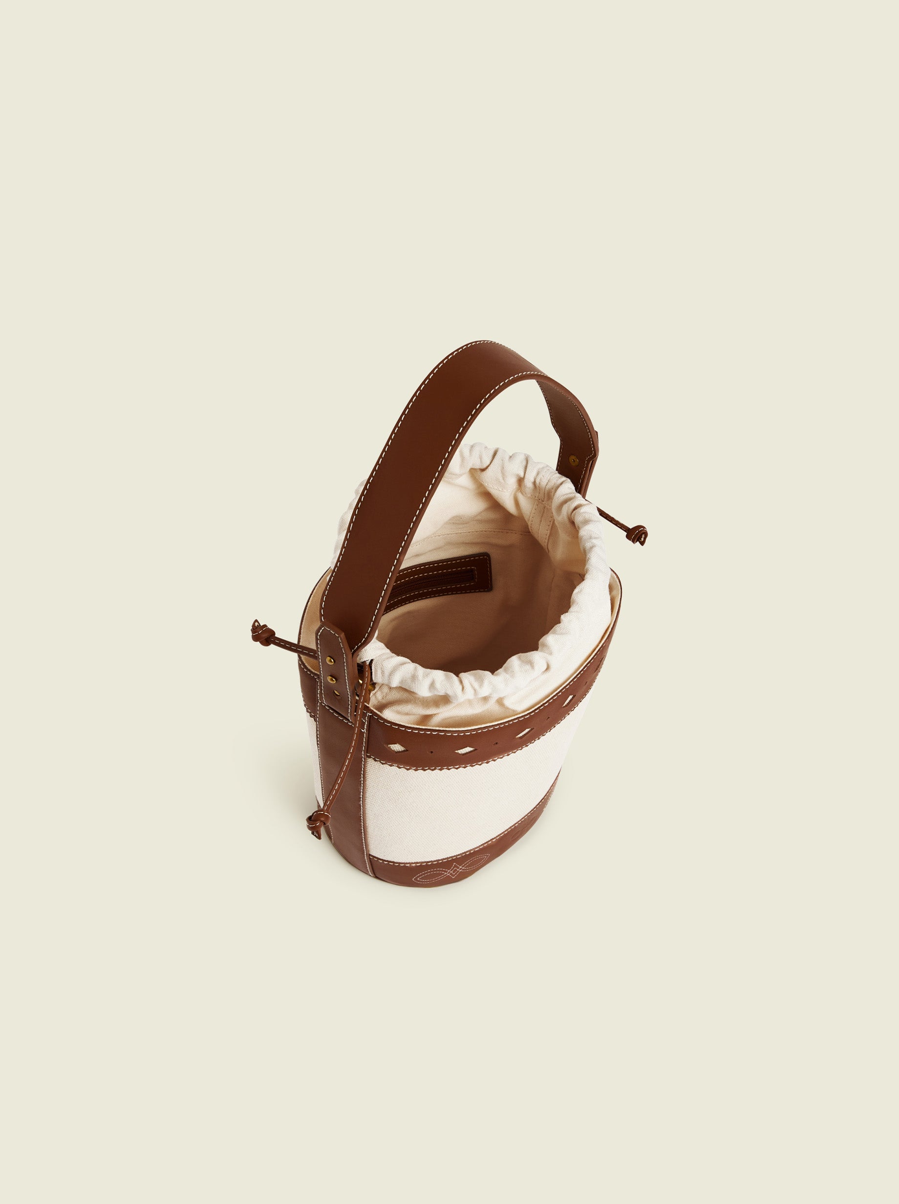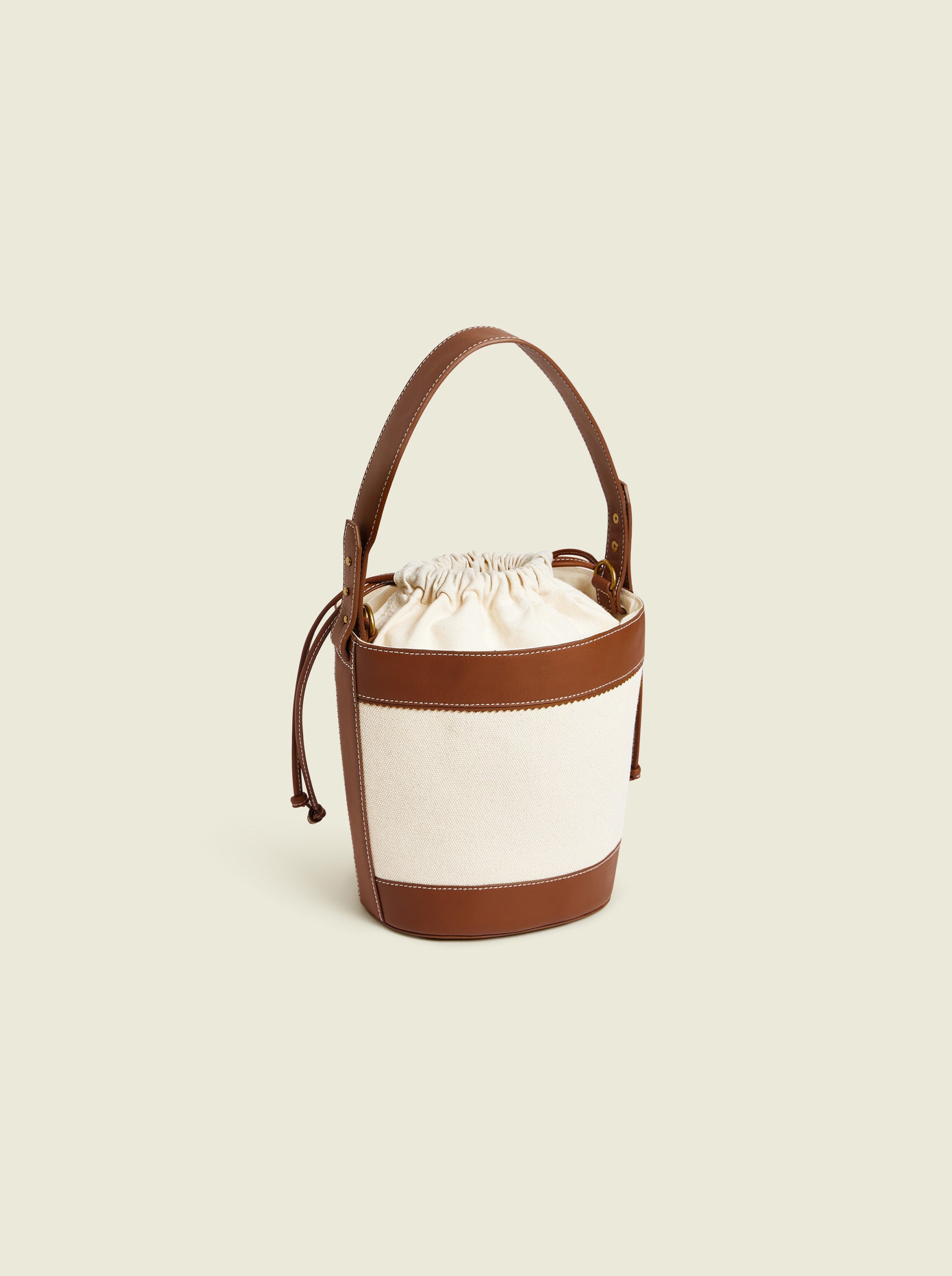 Ce sac seau en cuir de vachette et toile de coton épaisse offre un look décontracté et estival. Il se porte à la main, à l’épaule ou en crossbody grâce à ses deux bandoulières : une courte fixe, et une longue interchangeable.