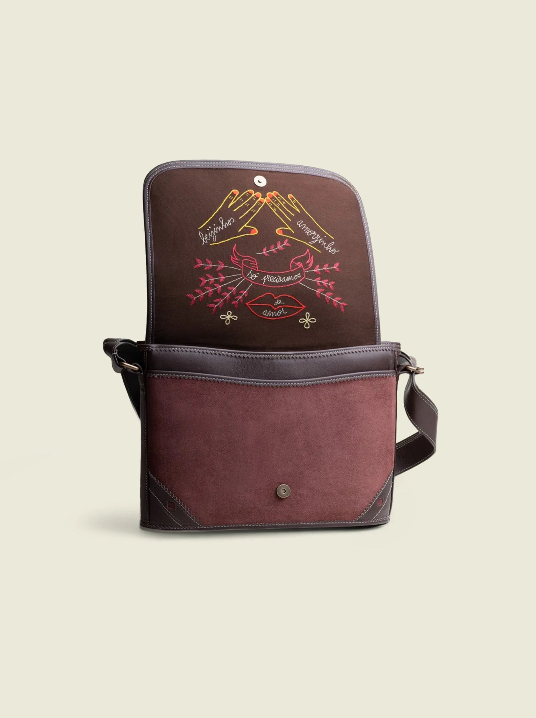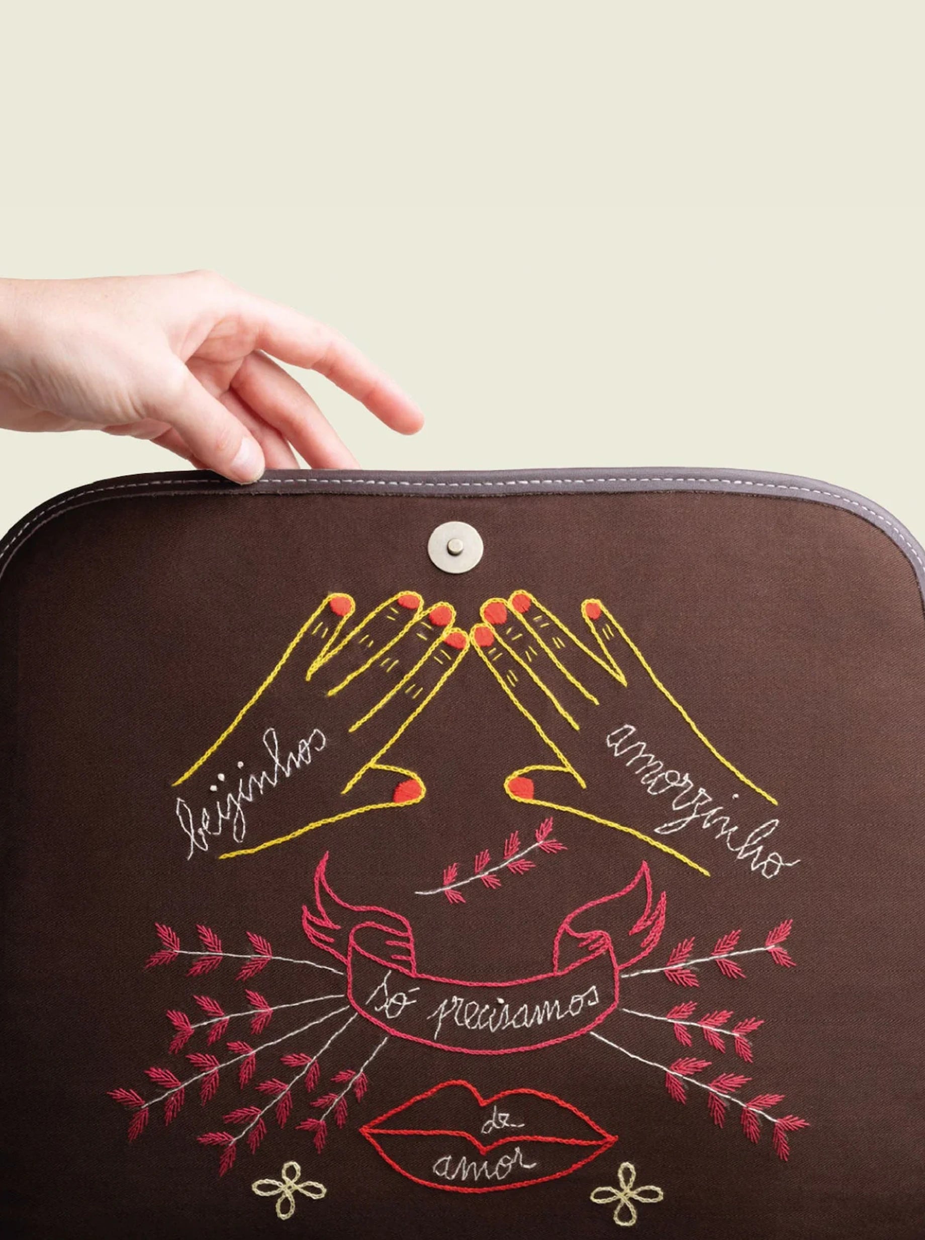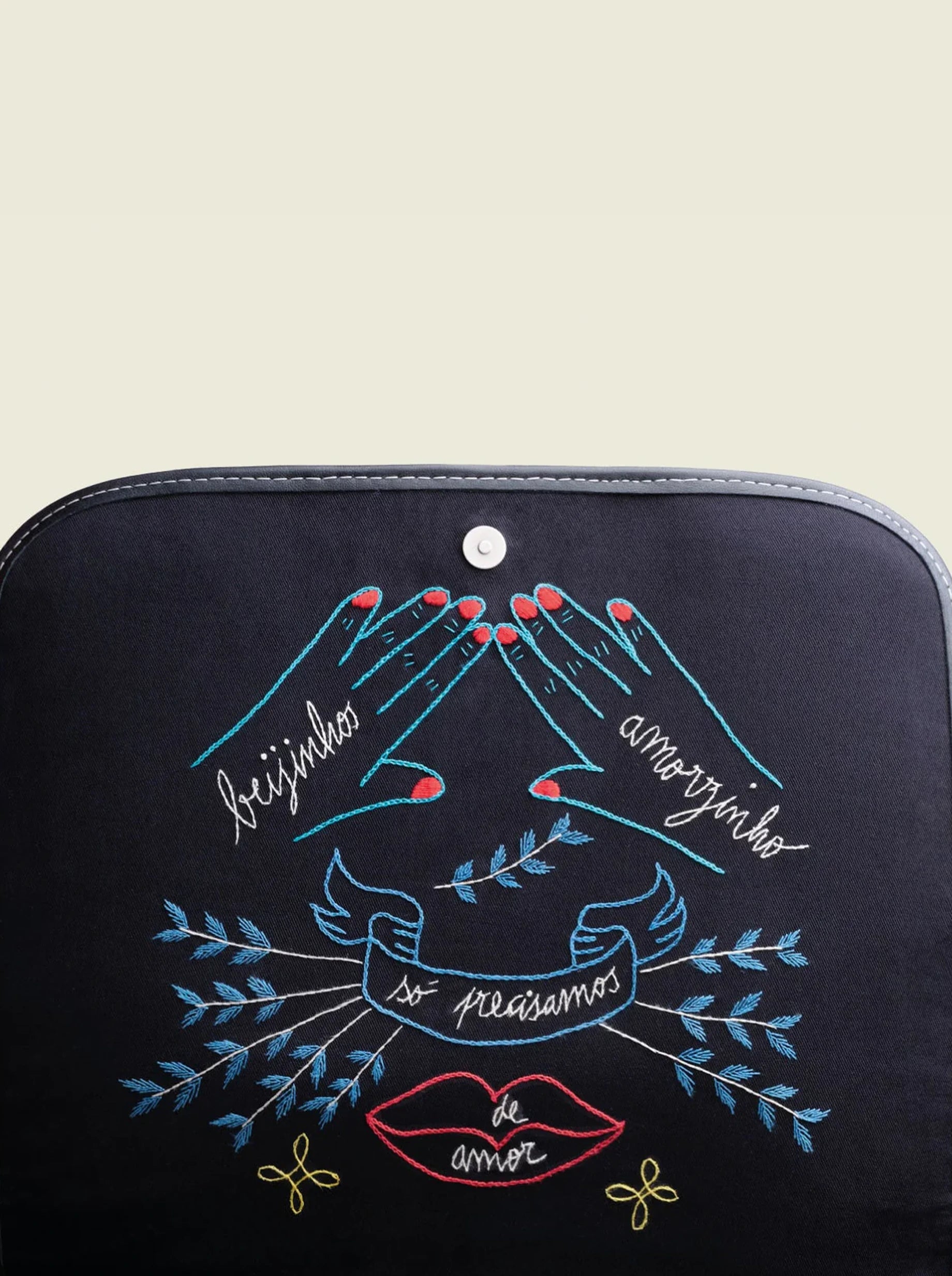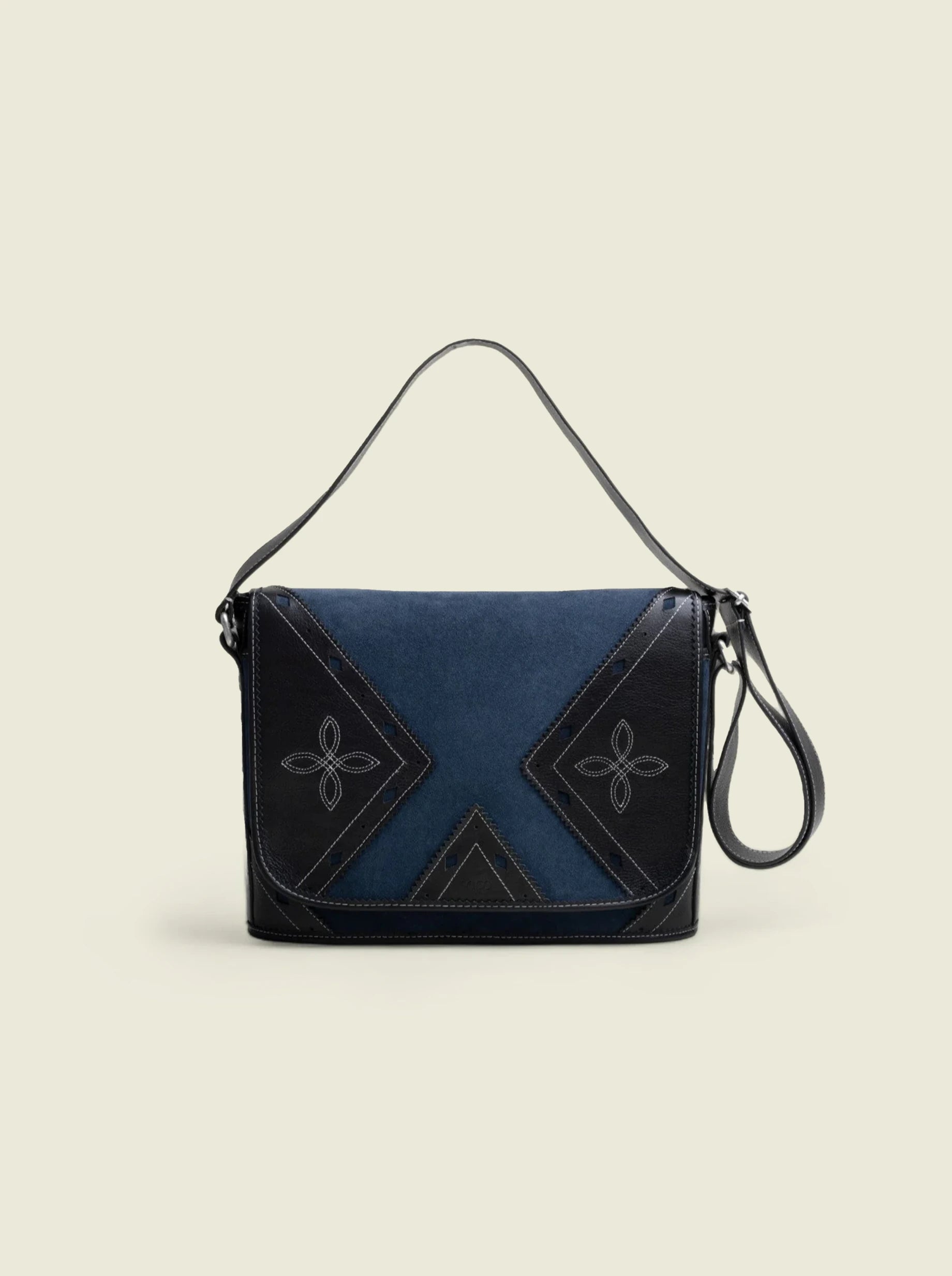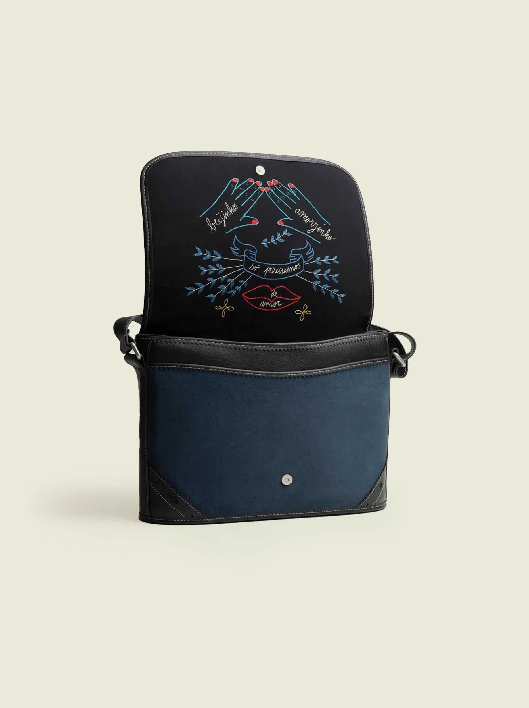 Ce sac cabas bi-matières se porte à l’épaule ou en bandoulière grâce à son anse réglable. Il est disponible en deux versions : une version épurée sans broderies, et une version brodée à la main par nos grands-mères portugaises, à partir d’un dessin imaginé en collaboration avec SOCO.