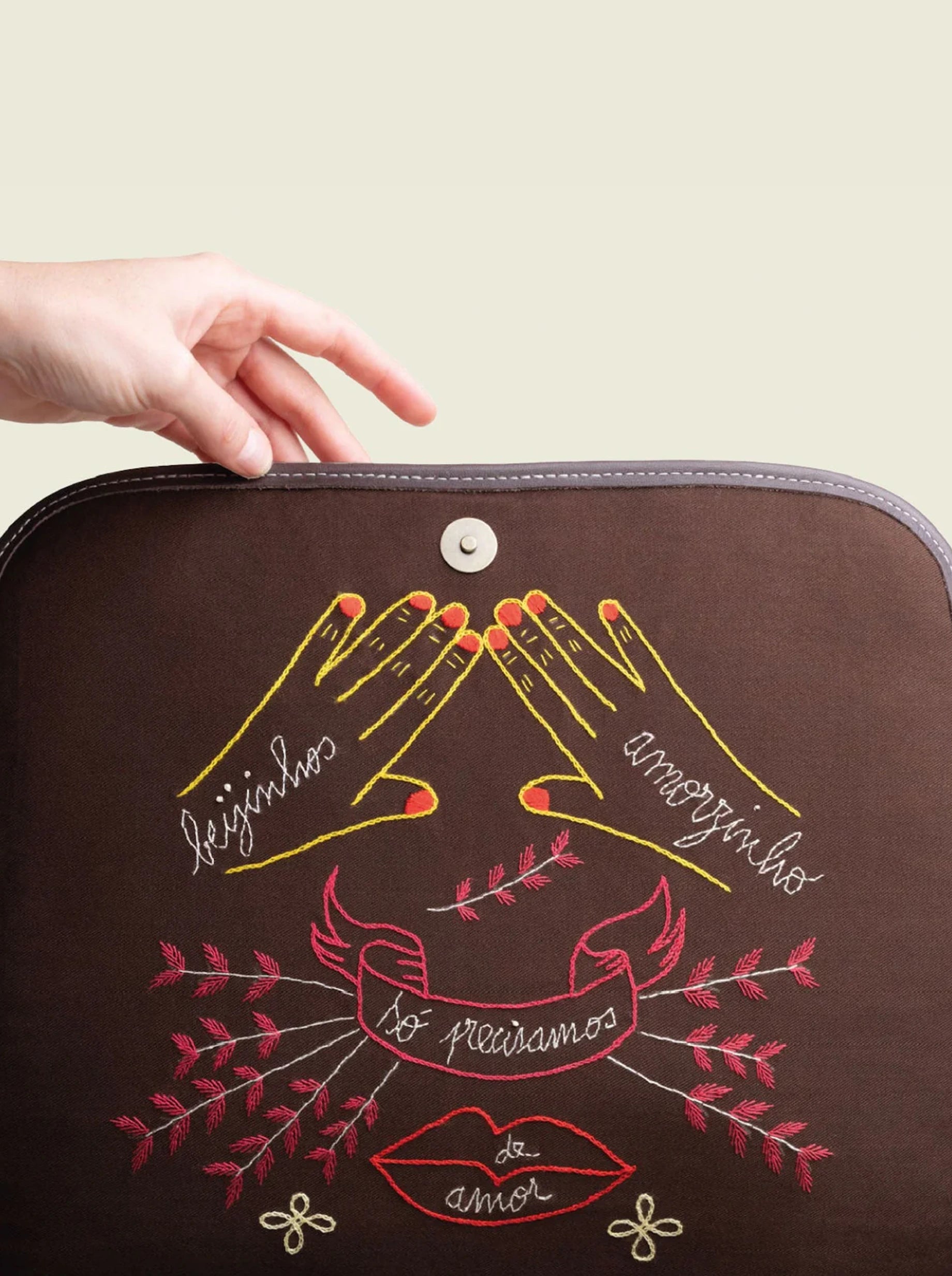Ce sac cabas bi-matières se porte à l’épaule ou en bandoulière grâce à son anse réglable. Il est disponible en deux versions : une version épurée sans broderies, et une version brodée à la main par nos grands-mères portugaises, à partir d’un dessin imaginé en collaboration avec SOCO.